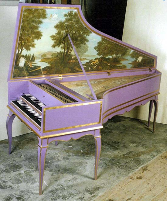Two manual harpsichord after Blanchet, Paris 1746, 2,28m long, compass FF - f³, lower manual 8' + 4', upper manual 8' + buff-stop, 1/2 tone transposition shift, manual stops, push-pull coupler, naturals with ebony key-tops, sharps in ebony with bone key-tops, stand