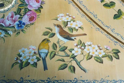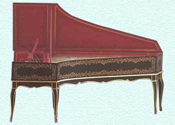 Zweimanualiges Cembalo nach Blanchet, Paris 1746, Länge 2,28m, Umfang der Klaviatur, FF - f³, Untermanual 8' + 4', Obermanual 8' + Lautenzug, Transponiereinrichtung um einen Halbton, Handregisterschaltung, Schiebekoppel, Untertasten mit Ebenholzauflage, Obertasten Ebenholz mit Knochenauflage, Fußgestell