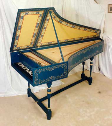 Einmanualiges Cembalo nach Blanchet, Paris, Länge 2,18m, Umfang der Klaviatur, FF - f³, 2 x 8' + Lautenzug, Transponiereinrichtung um einen Halbton, Handregisterschaltung, Untertasten mit Ebenholzauflage, Obertasten Ebenholz mit Knochenauflage, Fußgestell, Sonderausstattung: Individuelle Gestaltung des Gehäuses (siehe Abb. rechts)