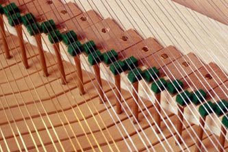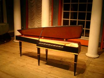 Cembal d'Amour Wohl auf der Suche nach einem neuen Instrument mit neuem Klang konstruierte Gottfried Silbermann 1721 das Cembal d'Amour. Dieses vereint im Prinzip zwei Clavichorde in einem Gehäuse, wobei die Klaviatur zentral plaziert ist. Angeschlagen werden die Saiten wie beim Clavichord durch Tangenten, die die Saiten genau in der Mitte der schwingenden Länge treffen und die Schallwellen über zwei Resonanzböden abgeben. Durch diese besondere Bauweise ist der Klang doppelt so laut wie bei einem herkömmlichen Clavichord.  |