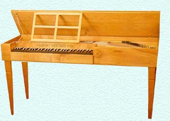 Clavichord nach C. P. E. Bach, Länge 1,50m, Umfang der Klaviatur FF - f³, doppelchörig besaitet, bundfrei, Stimmtonhöhe a' 440 Hz, Untertasten mit Ebenholzauflage, Obertasten Ebenholz mit Knochenauflage, vier ausschraubbare Füße