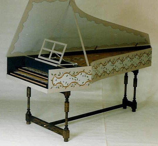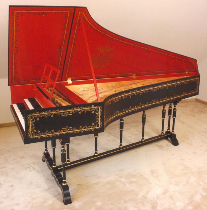 Zweimanualiges Cembalo nach Joh. Daniel Dulcken, Antwerpen 1755, Länge 2,55m, Umfang der Klaviatur FF - f³, Untermanual 8' + 4', Obermanual 8' + Lautenzug, gegen Aufpreis ist der Einbau eines 8' Nasal-Registers möglich, Transponiereinrichtung um einen Halbton, Schiebekoppel, Untertasten mit Ebenholzauflage, Obertasten aus Ebenholz mit Knochenauflage, Sonderausstattung: Individuelle Gestaltung des Gehäuses