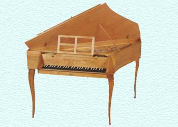 Spinett Modell- Silbermann, Länge 1,50m, Umfang der Klaviatur C - f³, im 8' klingend, geteilter Lautenzug, Transponiereinrichtung um einen Halbton, Untertasten mit Ebenholzauflage, Obertasten Ebenholz mit Knochenauflage, drei ausschraubbare Füße