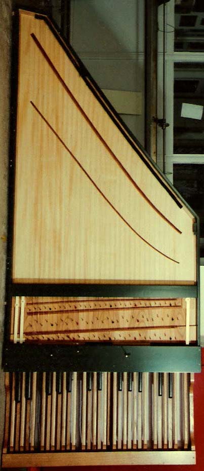 Pedal-Cembalo in historischer Bauweise, Gesamtlänge (mit Sitzbank) 3,04m, Umfang der Klaviatur C - f '', die Klaviatur kann nach Ihren Wünschen radial oder parallel angefertigt werden, 16' + 8' + 4', Fußschaltung.