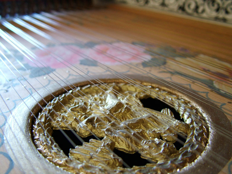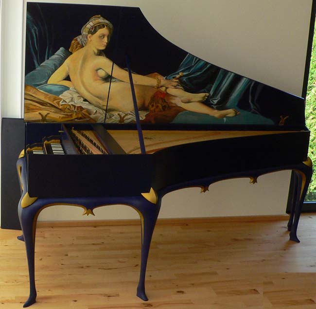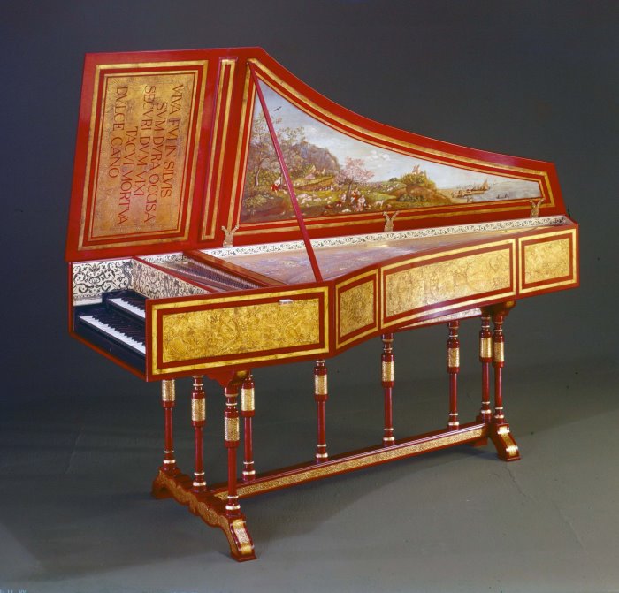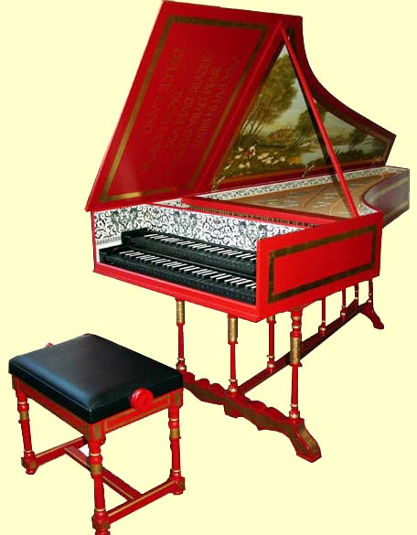 Zweimanualiges Cembalo nach Joh. Ruckers, Antwerpen 1640, Länge 2,25m, mit originalen Tonumfang von G/C - d³ oder mit erweitertem Tonumfang von GG - f³ und französicher Klaviatur, Untermanual 8' + 4', Obermanual 8' + Lautenzug, Transponiereinrichtung um einen Halbton, Handregisterschaltung, Untertasten mit Ebenholzauflage, Obertasten aus Ebenholz mit Knochenauflage, Innengehäuse tapeziert, Fußgestell.