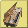 FF - f³, doppelchörig mit Messing besaitet, Tonhöhe a' 415 Hz, bundfrei, Untertasten mit Ebenholzauflage, Obertasten Ebenholz mit Knochenauflage, vier ausschraubbare Beine